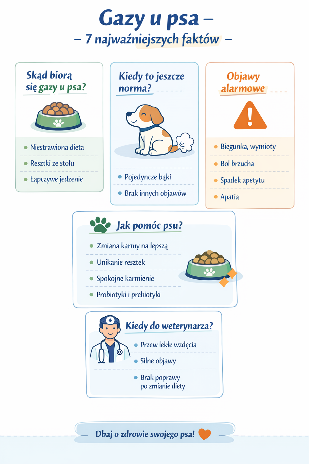 Pilnej konsultacji wymaga sytuacja, gdy gazy pojawiają się razem z bólem brzucha, wymiotami, silnym wzdęciem, apatią, osłabieniem lub wyraźnym spadkiem apetytu. Niepokojący jest także przewlekły problem, który nie ustępuje mimo zmiany sposobu żywienia.
