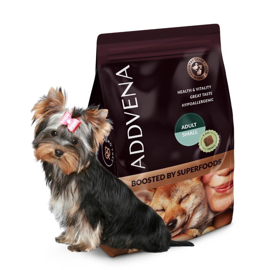Rozwiązaniem może być Addvena Boosted By Superfoods Adult Small dla yorków – wysokomięsna, bezzbożowa karma bez kurczaka, wzbogacona naturalnymi dodatkami SUPERFOODS wspierającymi odporność, mikrobiotę jelitową oraz ogólną kondycję psa.